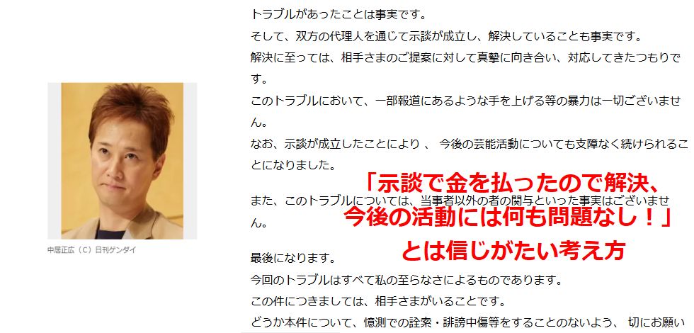 示談してお金を払ったから問題なし!とは大きな勘違い:中居の性スキャンダルほぼ犯罪行為をしたのに示談が成立したから「無罪」とはならない、犯罪行為は消える訳でもなく刑法的にはお構いなしと なっても社会的な制裁は当然受けるべき。過去同様なトラブルを起こしてきたがジャーニーズのもみ消しで露呈を免れて 甘く考えている? |