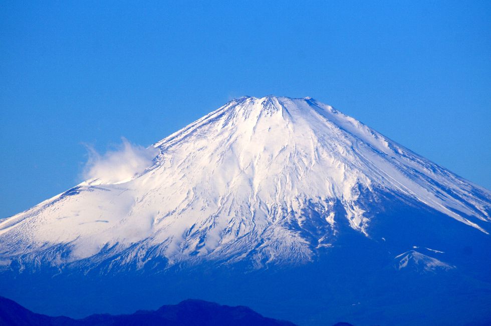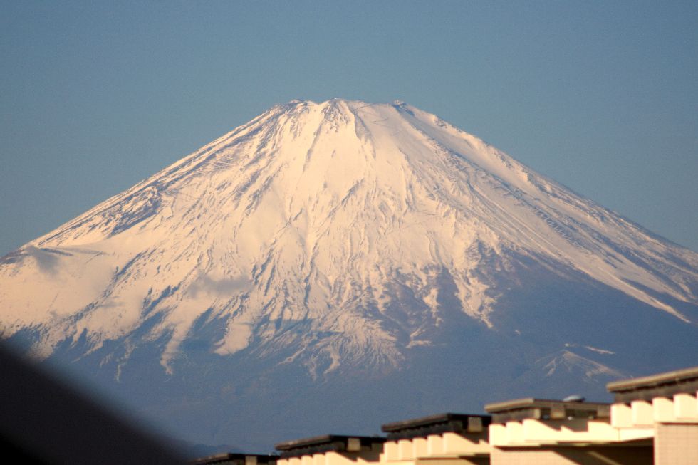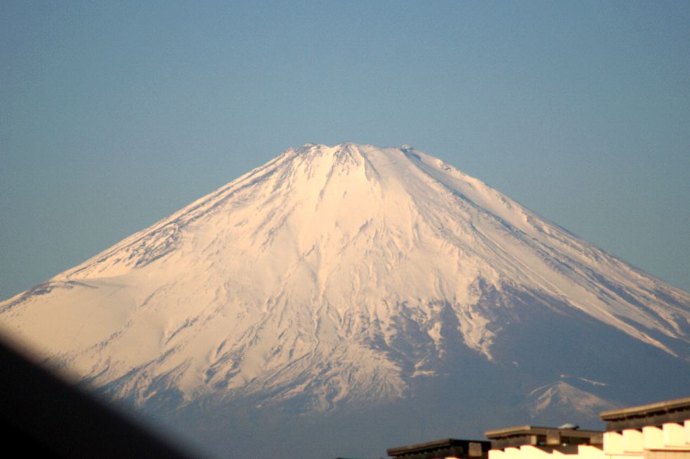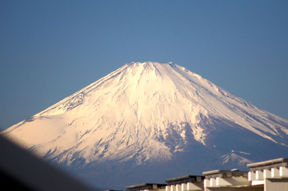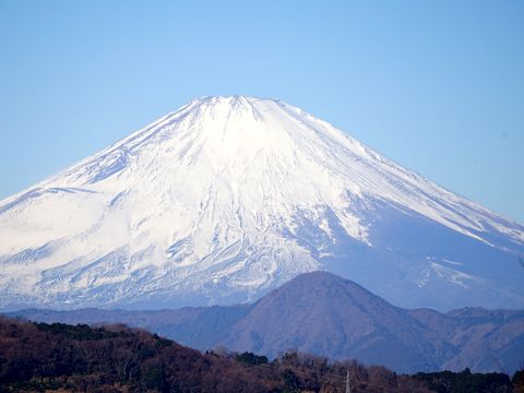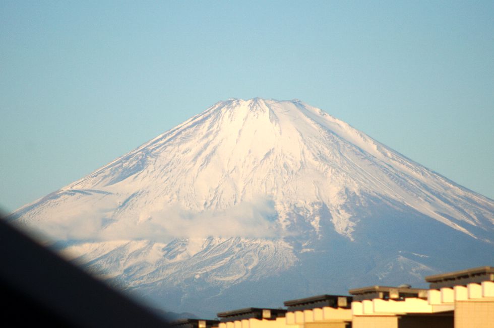 風もなく綺麗に見える富士山宝永火口あたりには風で飛ばされる雪が見えているが、雲はほぼなく綺麗な富士山が見られた。 |
