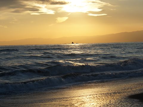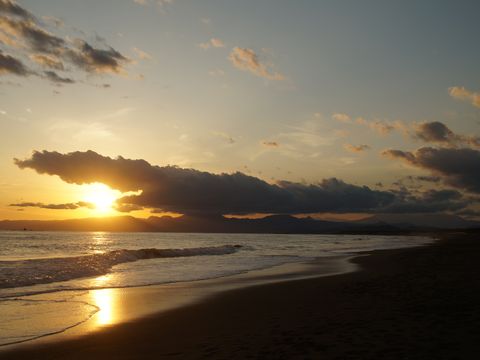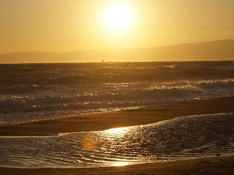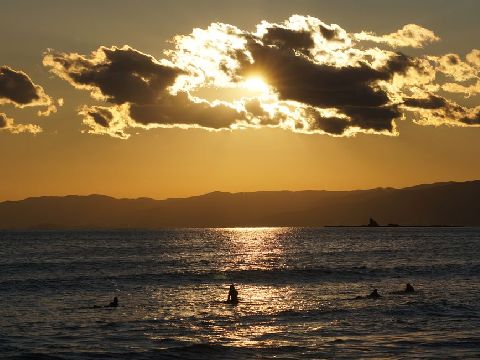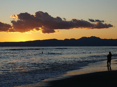 夕方の海岸で今日は一日風もなく暖かな一日、海岸も波が無くサーファーには厳しい状態。 |