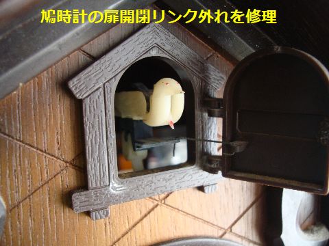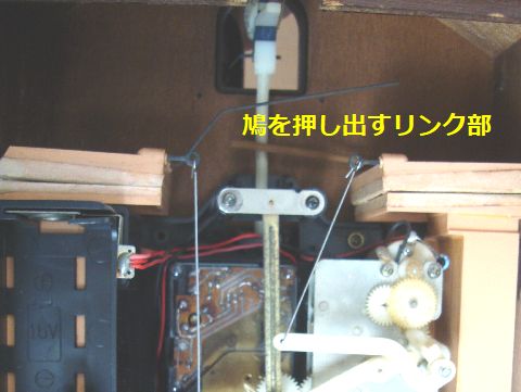 鳩時計の軽修理:鳩の窓が開いたまま何故か鳩の窓が開いたままに、この窓は2つのリンクで押されて開く、1段目で窓が開き鳩が出てくる、2段目で鳩が羽根を 開いて鳴くという段どり。窓は鳩の取り付け下部の穴に細いピアノ線で接続されているが、それが外れたのが原因。 |