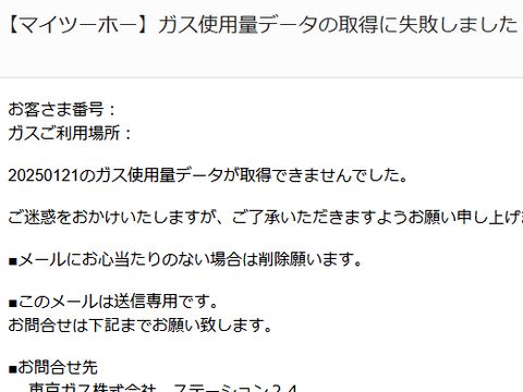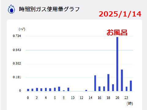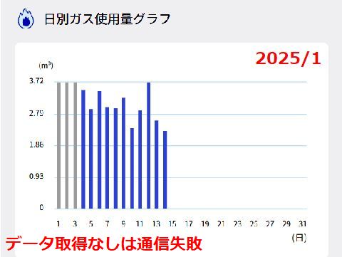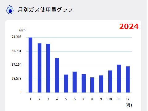 便利な機能がいろいろ有って、月500円ガスを長時間使い続けるとオンラインで監視していて、確認の電話が掛かってくる(実際に煮込みで起きた)。 ガス使用料は冬季が圧倒的に多い、検針結果と請求はずれがあるので料金とは合致していない。 |