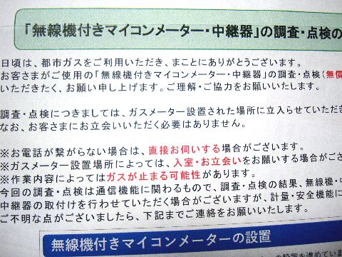 東京ガス・マイツーホーが不調昨年末から度々データ取得失敗が起きていて、今日端末機(無線)の調査のために訪問の連絡あり、エラーが続いているので そのうちに言ってくるだろうと待っていた。点検は外のメータボックス内なので立ち合いや室内立ち入りは不要。 |