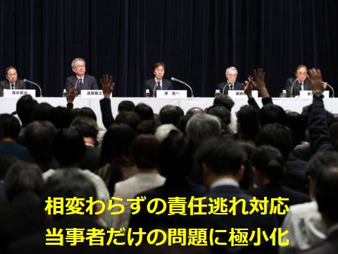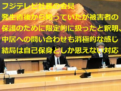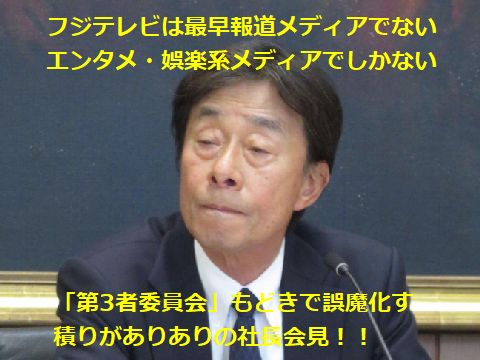 誠意ゼロの会見でフジテレビは破滅へまっしぐら「他人には厳しく自分達には大甘で」がフジテレビの社是なのかと思える社長会見のズルさ、何とか規模を小さく、具合の悪い事は 生中継や動画撮影も禁止するというご都合主義に満ちていた、小林製薬の不祥事やトラブルには強い口調で迫っていたのは一体誰? 「第三者委員会設置」もどうやら「第三者委員会もどき」で誤魔化そうという魂胆らしいが、国民注視の中でのインチキは更に不信感を 増長するだけと解らない? |