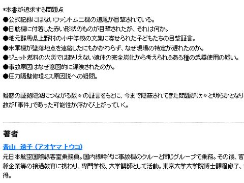 胡散臭さ満点の事件:JALジャンボ機墜落事件事故発生時にアメリカに出張中で500人以上死亡の事故と聞いて驚いた記憶あり、確かに腑に落ちない胡散臭い点が多く、むりやりに 隔壁補修のミスとして強引に幕引きしたという疑惑が拭えないのも事実。 |