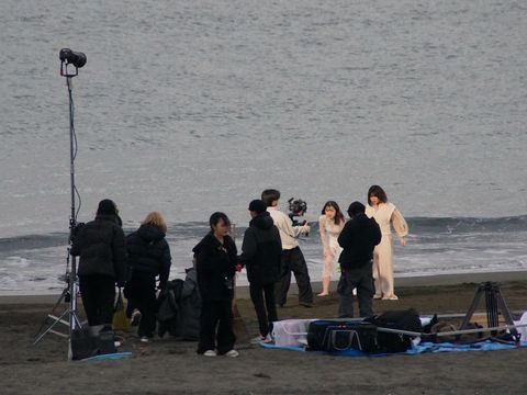 海岸ではCM?撮影時々見かけるCMやTVの撮影をしている風景、最寄にある公園駐車場には品川ナンバーのロケバスが3台いた。 |