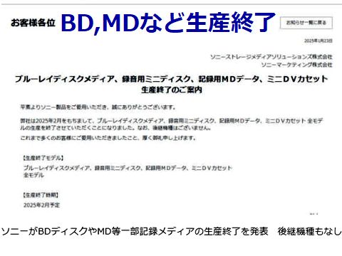 ブルーレイディスクも生産完了にSONYがブルーレイディスク、MD、ミニDVカセットの生産完了予定と発表、もう売れないメディアになってしまった、 BDなどまだ25年位なのに、時代の変化は速い。 何故か3種ともうちにはあった、ブルーレイの書き込み可能メディアは海外製だけど。MDはもうプレーヤがない、ミニDVカセットは SONYのビデオカメラ用(まだ動作する)。 |