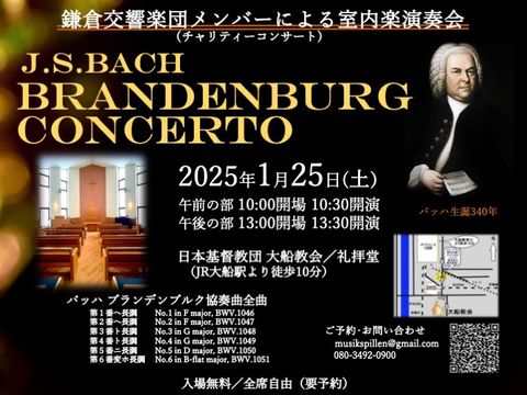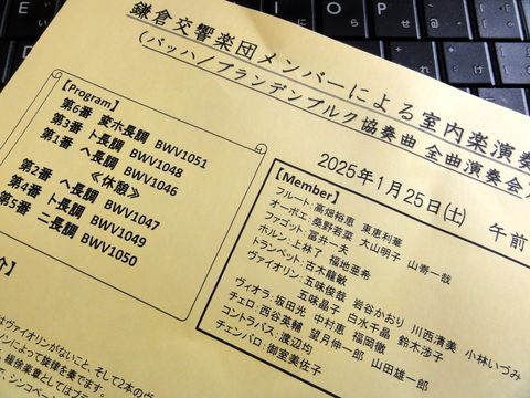 鎌響メンバーによるブランデンブルグ協奏曲・全曲演奏会演目は、バッハ:ブランデンブルグ協奏曲・演奏順は第6番、第3番、第1番、第2番、第4番、第5番。 狭い礼拝堂(プロテスタントなので簡素)なので演奏者の入替のたびに真横の狭い通路を楽器を持って出入りする事態に。 距離が近いので楽器の生の音をしっかりと楽しめた。 |