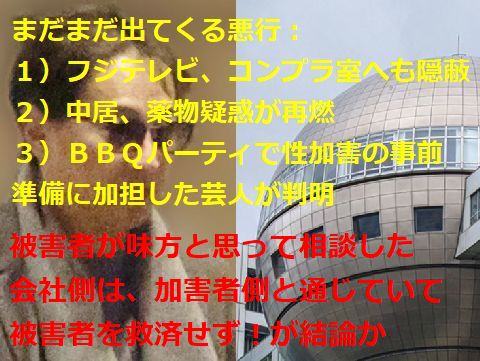 まだまだ出てくるフジテレビの闇性加害の前段階(被害者を安心させて犯行に及ぶため)で犯行の数日前にBBQパーティがあったと報道。 参加してした鶴瓶とヒロミは共犯としか思えない、また計画性があったことも明白。これが初犯とは到底思えず 被害者は沢山いるはず。プロデューサAは中居から指名のあった被害者を上納する担当だったよう。 |