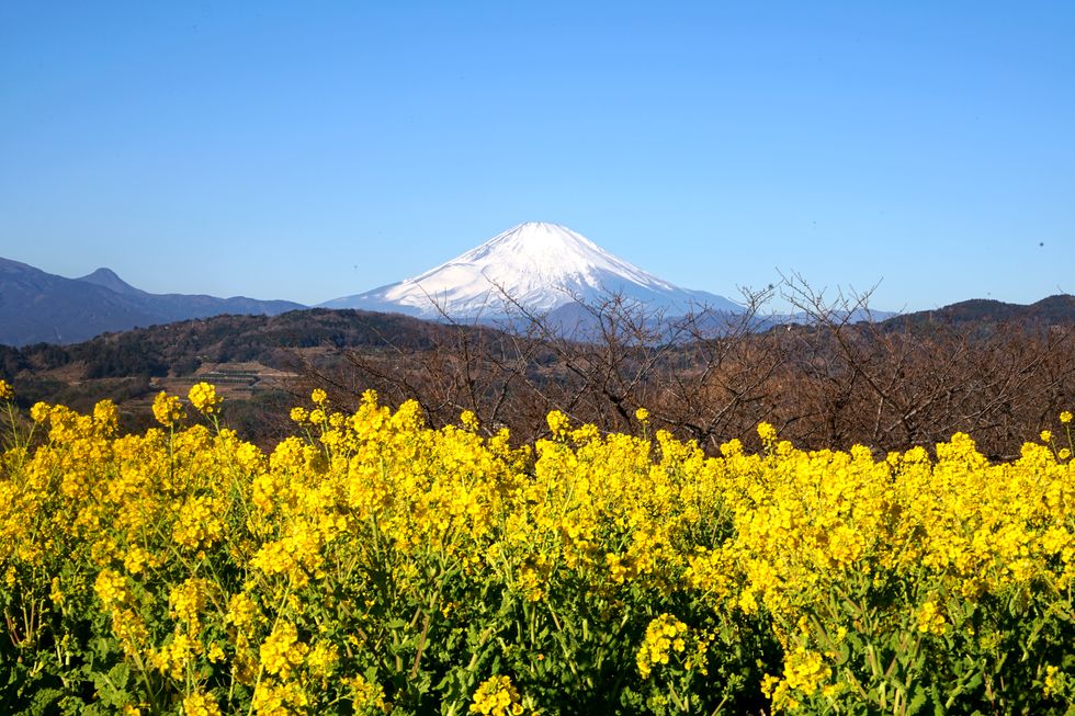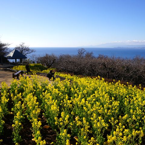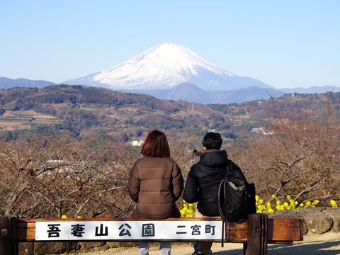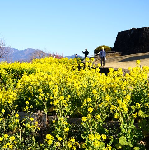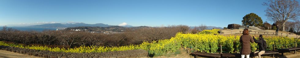 菜の花と富士山朝7時過ぎのバスで出発、」駅前で朝食を食べて電車で二宮駅へ。駅から5分で役場口登り口、そこから 300段の階段を上り(これがきつい)、尾根伝いにあるいて山頂の展望ポイントに着いたのは8時半過ぎ。 |