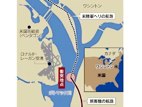 ワシントンで航空機事故・空中衝突この航路を見ると着陸前に旅客機は滑走路へ侵入のため左へ緩く旋回している、一方の軍用機は旅客機は真っすぐ進むと誤解して そのまますれ違えると進み衝突に見えるが。この空港は大昔に利用したはず(ワシントン>ヒューストン)だが記憶はあいまい。 |