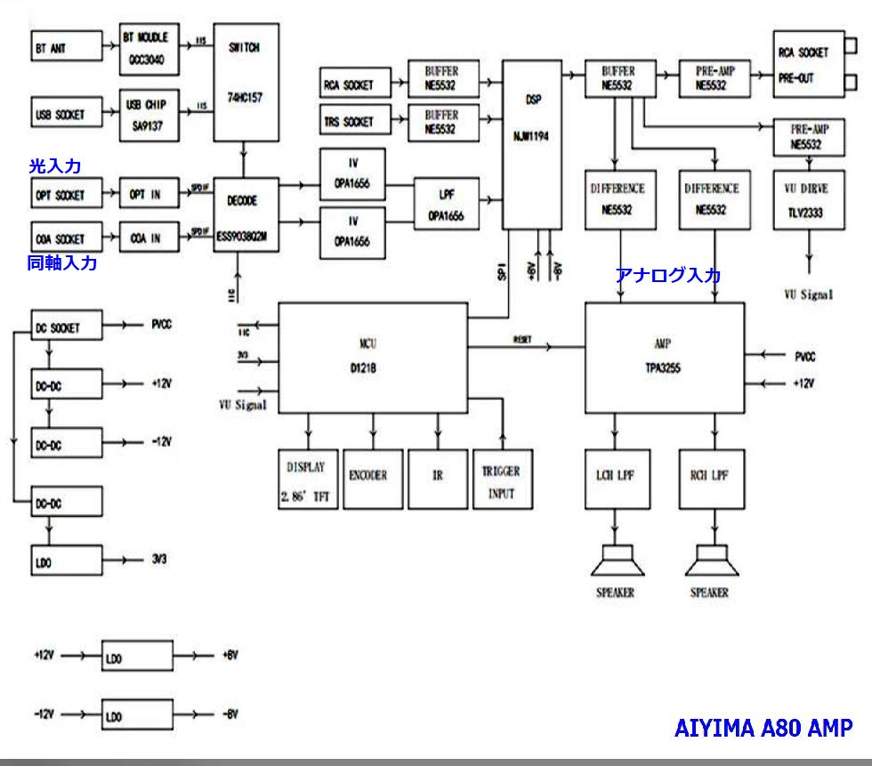 AIYIMA A80 内部構成図これを見ると、光・同軸のデジタル信号はいったんD/Aでアナログ信号に変換して、デジタルアンプ部へ入力される 構造で完全デジタルとは程遠い構成になっている。現用機は完全デジタル構成のアンプでアナログ部はない。 |