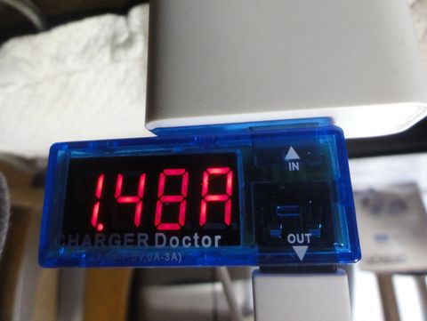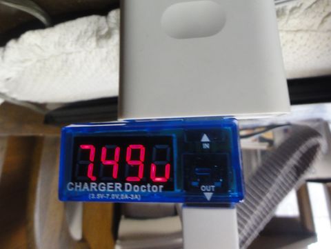 スマホの充電電圧・電流PD対応なので7.5Vで充電、1.5Aくらい流れているので充電時間が短くできる。最近のものではもっと 高い電圧・大電流で高速充電するものもある。 |