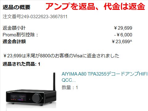 返品したアンプ、AMAZONの返金処理2月8日までに入金するとの連絡が来た、カードへ戻るので時間がが掛かる。良いアンプだと思ったのだが残念だった。 |