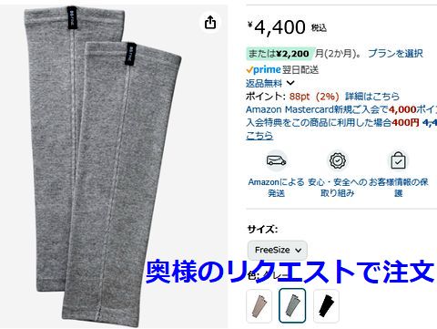 最近の買い物:レッグウォーマ、保護ガラスシート奥様のリクエストでレッグウォーマ(新聞広告に出ていたもの、AMAZONで購入)、義兄スマホ用の保護ガラス(メルカリで購入)。 |