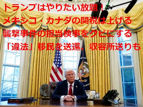 トランプの関税やりたい放題、始まるカナダとメキシコに25%、中国に10%の追加関税を掛けるとずっと前から言ってはいたけど、まさかやるとは、 という呆れたという声が多い。航空機事故でも何でも、悪いのは全て前政権のせいだと責任を押し付けるやりたい放題の対応。 |