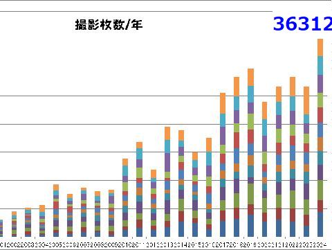カメラの撮影枚数データ2024年は年間36,312枚を撮影(動画データは除外)、特に12月は4,250枚と記録達成?1月も4,204枚と順調に伸びている。 αCafeのBRAVO獲得のためにもせっせと撮影し投稿するしかない。 |