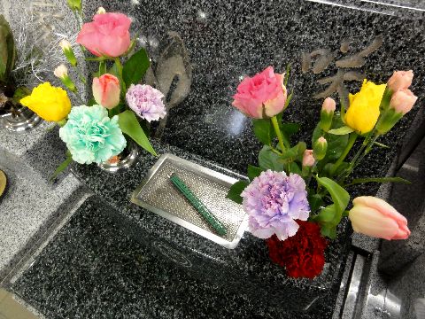 一日遅れで墓参りに昨日は寒くて延期した墓参りに、イオンの98円切り花は復活していた。前回の花がまだ大丈夫だろうと少な目に買ったら 以外に前回の花はダメになっておりややスカスカの感あり。 |