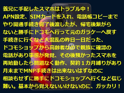 義兄のスマホで一日混乱!まあ何と言うか「情弱老人」なので、勝手にドコモへ相談にいって混乱を起こすという事態に。 |