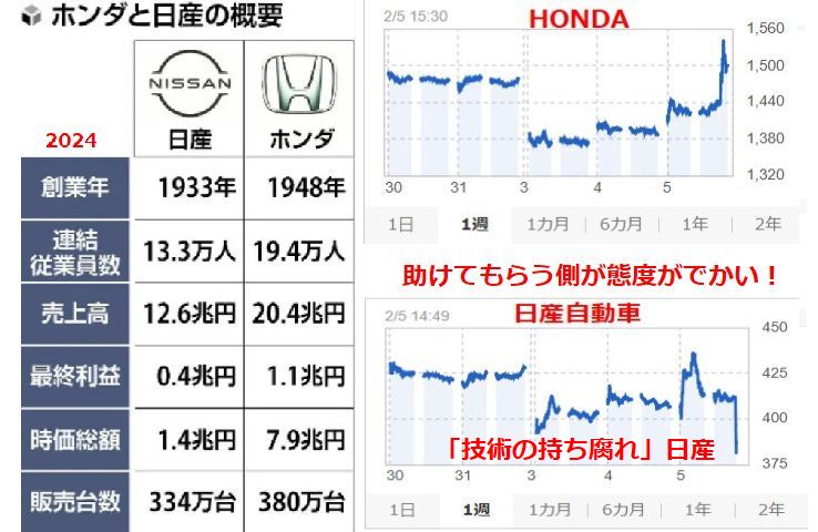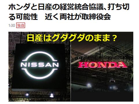 ホンダ日産の統合は先行き真っ暗?日産側がホンダの要求するリストラによる改革を進められず、ホンダの苛立ちが伝わるよう。 |