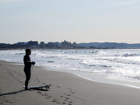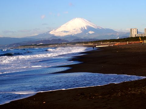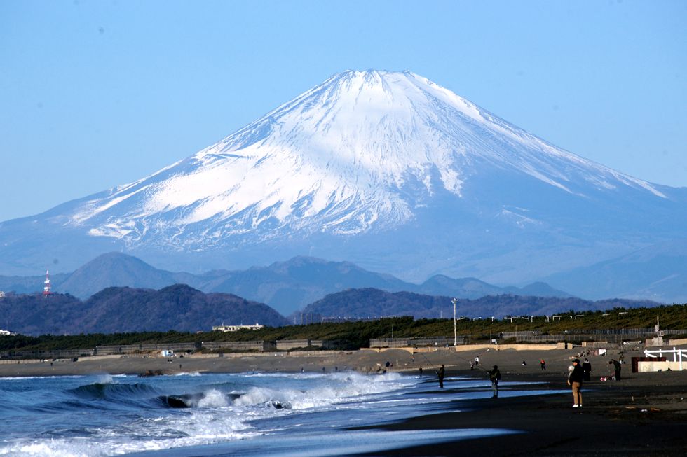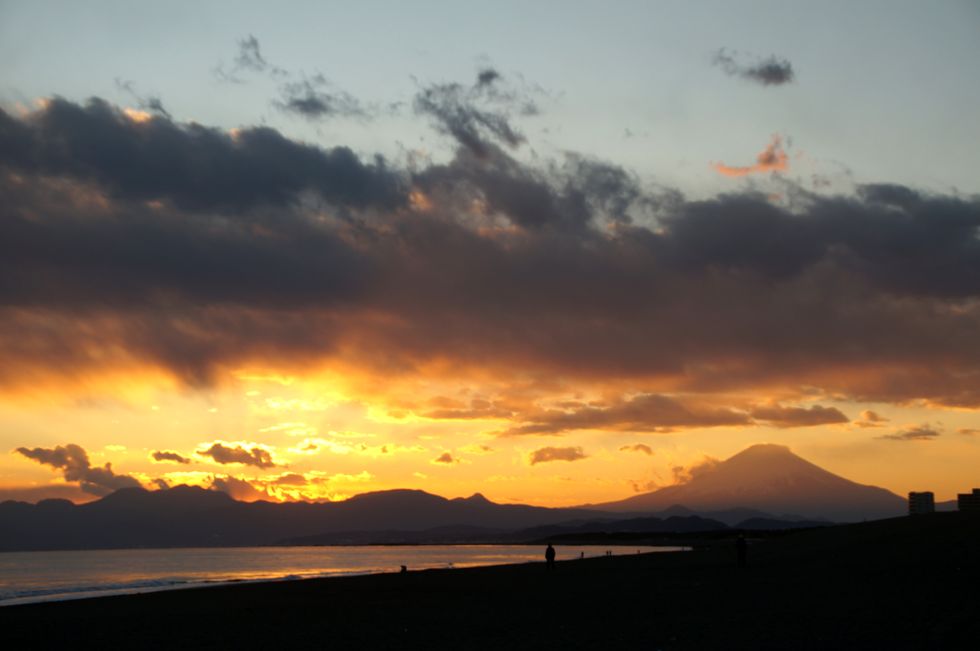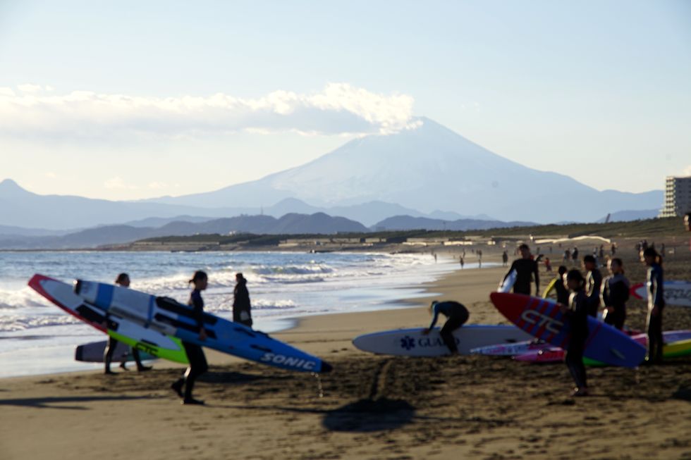 朝の綺麗な富士山鵠沼海岸にはサーファー多数、辻堂海岸は汐が引いていてサーファー少なし。 |