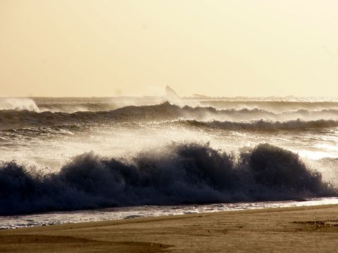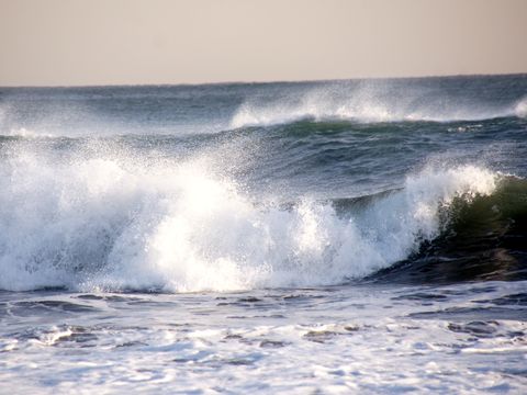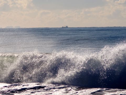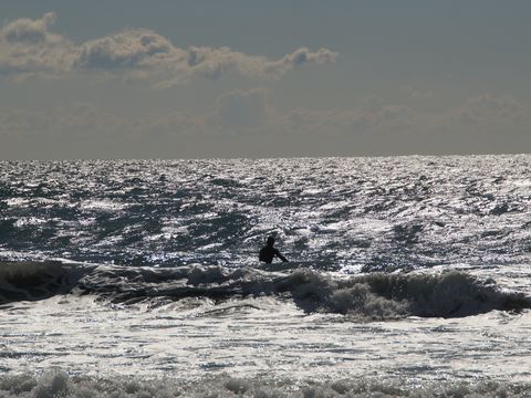 烏帽子岩も霞んで見える波しぶきサーファーも少数だがいる、上級者だろう。 |