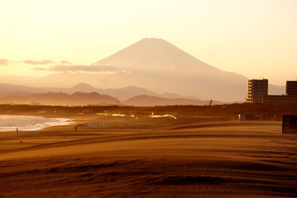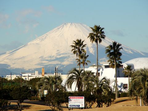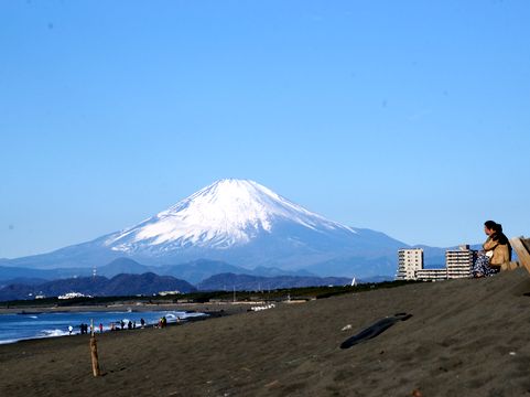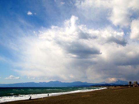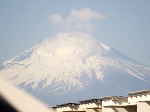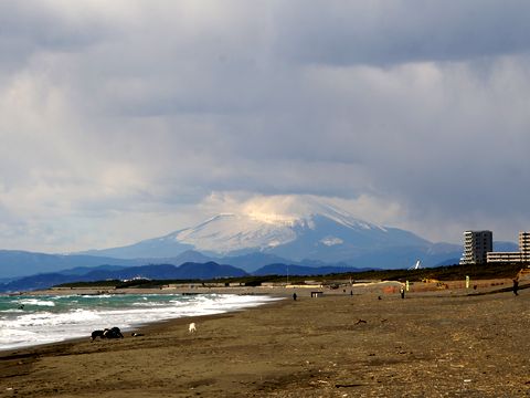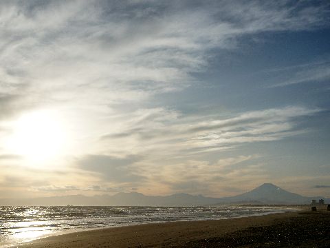強風の中の富士山強い南風で砂が飛んで海岸遊歩道は歩きずらい、だから誰もいない。 |
