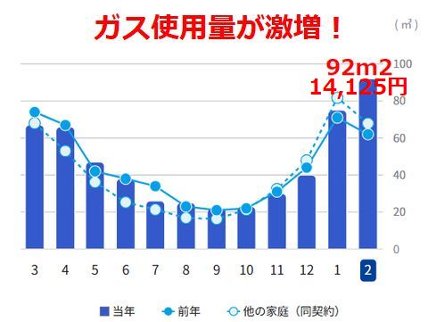 1月分はガス料金高騰寒波のせいで風呂を沸かすガス使用量も増え、さらに床煖房の使用時間も大幅に増えたので当然の結果。 |