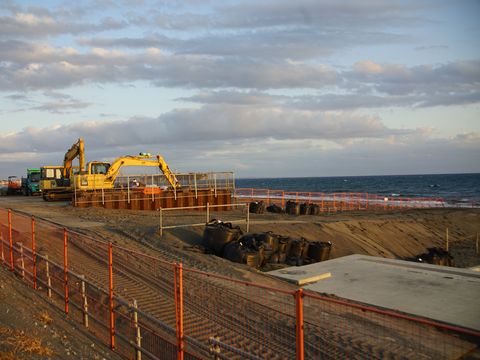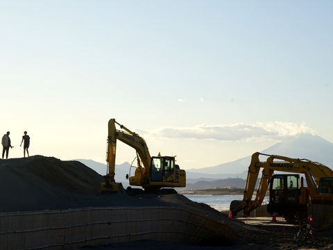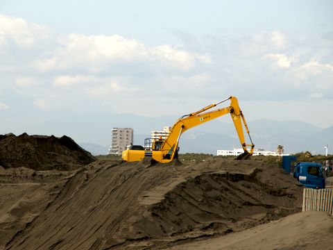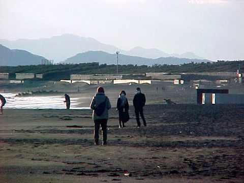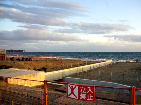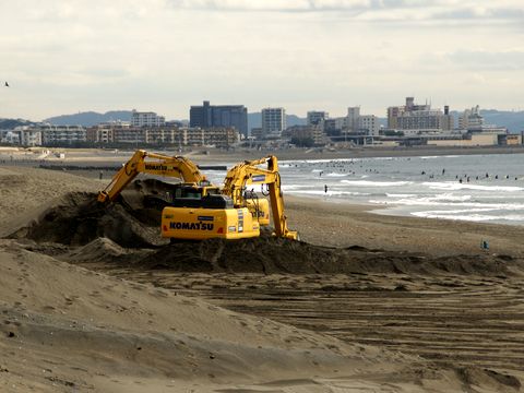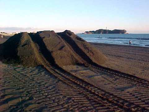 海岸の砂を搬出このあたりは砂が集まってくる場所なので余計な砂は集めて、ダンプトラックで搬出、どこへ持って行くのかは不明。 少し西側の茅ケ崎あたりでは海岸沿いが侵食されて段々と砂浜が痩せてゆく場所もあり。 |
