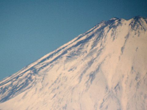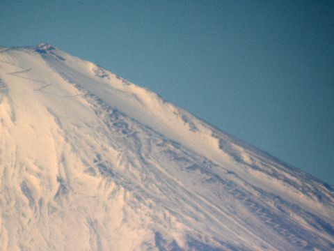 山頂から南側と北側南側は御殿場からの登山道が見えている、北側もギザギザの登山道がクッキリ見える、強風で雪が飛ばされて露出。 使用カメラ:CANON EOD5D+超望遠レンズ(800-1200mm) |