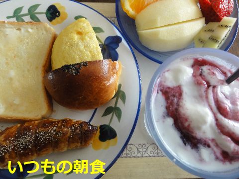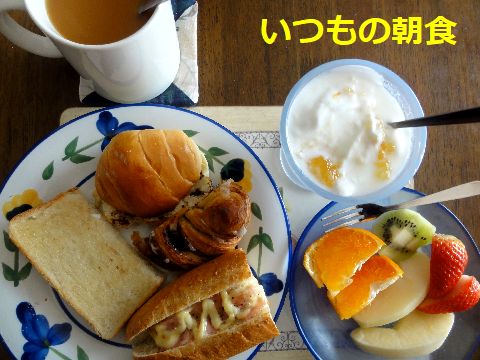 いつもの朝ご飯だいたい毎日こんな感じの朝ご飯、パンは少しずつ入れ替わる、ヨーグルトも色々あり。 |