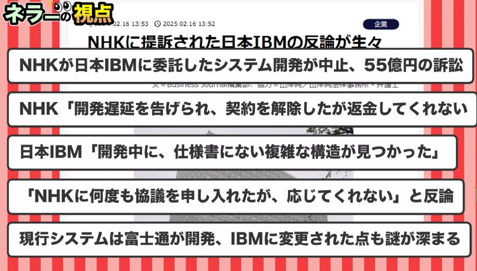 日本IBMもグダグダ?NHKに告訴される新しい営業システムの開発がグダグダで大幅納期遅れ(まだ完成してもいない)で、NHKが契約を打ち切り日本IBMを告訴、 一体何が起きているのか? |