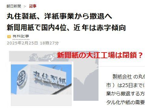 新聞紙生産4位の丸住製紙が撤退!採算悪化で新聞紙生産から撤退との報道、従業員500名。大江工場で2つの抄紙機ラインを稼働させていたが撤退する。 現役時代に関わったシステム案件のうち、この丸住製紙・大江工場を含めてキリンビール・栃木、三井軽金属加工・大牟田が廃止となった。