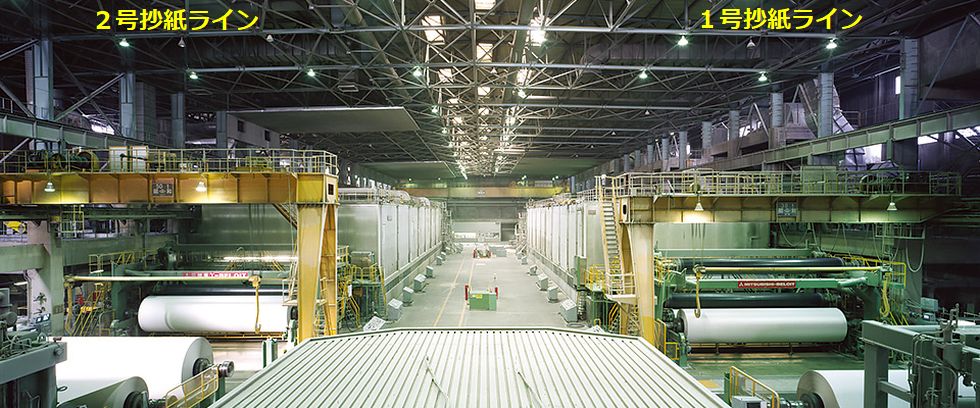 大江工場内部・1/2号抄紙機ライン1号ライン(抄速1100mだったかな)は1979年稼働、2号ラインは1988年稼働(やや速度アップ?)、抄紙機は三菱重工製、ドライブシステムは 東芝が納入(TOSBAC-40による抄紙機速度制御)。続く仕上げ工程も計算機制御システムを納入した。厚み(正しくは単位面積あたり質量)を測るX線坪量計は横河電機製。 |
