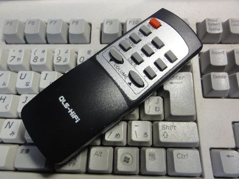 DEQ2496入出力設定画面とQA100リモコンデジタルイコライザには多数の機能があるが現在利用しているのは主に入力切替機能(FMチューナと再生系の切り替え)、 イコライザ機能はマイクを使い測定して補正を掛ける機能、設定済。リモコンはアンプ用、電源ON/OFF機能はなし。 |