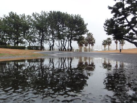 小雨けぶる海岸を散歩北風が強いがサーファーが少数、潮は引いているので砂の模様が残る、放水路の先は埋もれて水が溜まったままに。 |