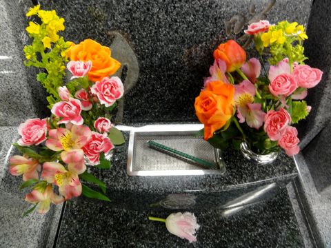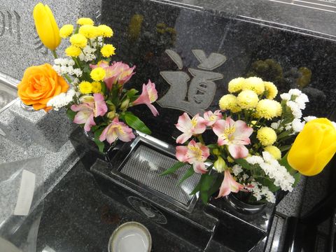 寒い中、墓参りに花はチューリップや菜の花など季節の花も交えて購入、寒いので他には誰もいない。 |