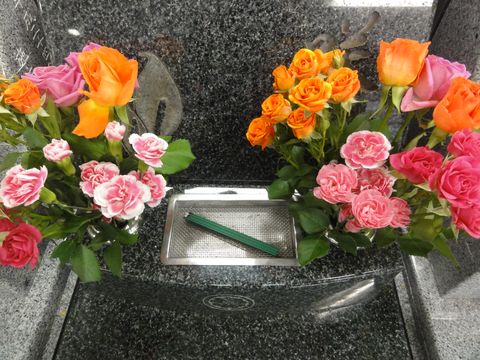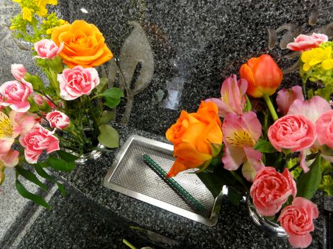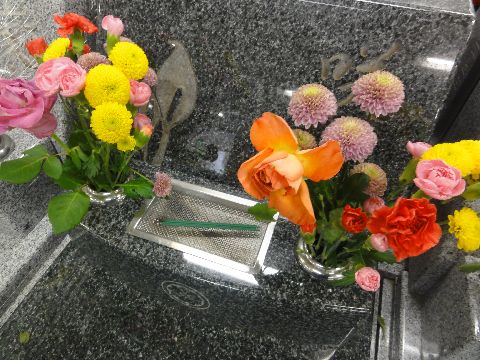 墓参りにいつものようにイオンで花を買おうとしたら「お彼岸」で99円の花はなし、バラとカーネーションを買って霊園へ。 お彼岸なので霊園にはいつもの花屋さんが3軒出店。下は岐阜墓のお墓。 |