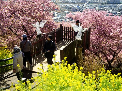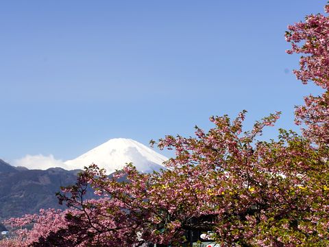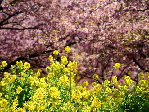 松田の河津桜は見頃朝8時半前の電車で出発、松田駅には9時半に到着、バス(180円)で公園駐車場まで移動、桜散策路を下って駅へ戻った。 公園部は桜満開、下の方はもう葉が出ている状態、菜の花はややピークを過ぎている状態。富士山は綺麗に見えたが段々と雲が掛かってきた。 |