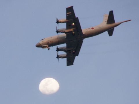 対潜哨戒機と月が重なっていつも夕方に哨戒任務から帰ってきる対潜哨戒機、ちょうど月と重なると解り撮影、タイミング難しい。 |