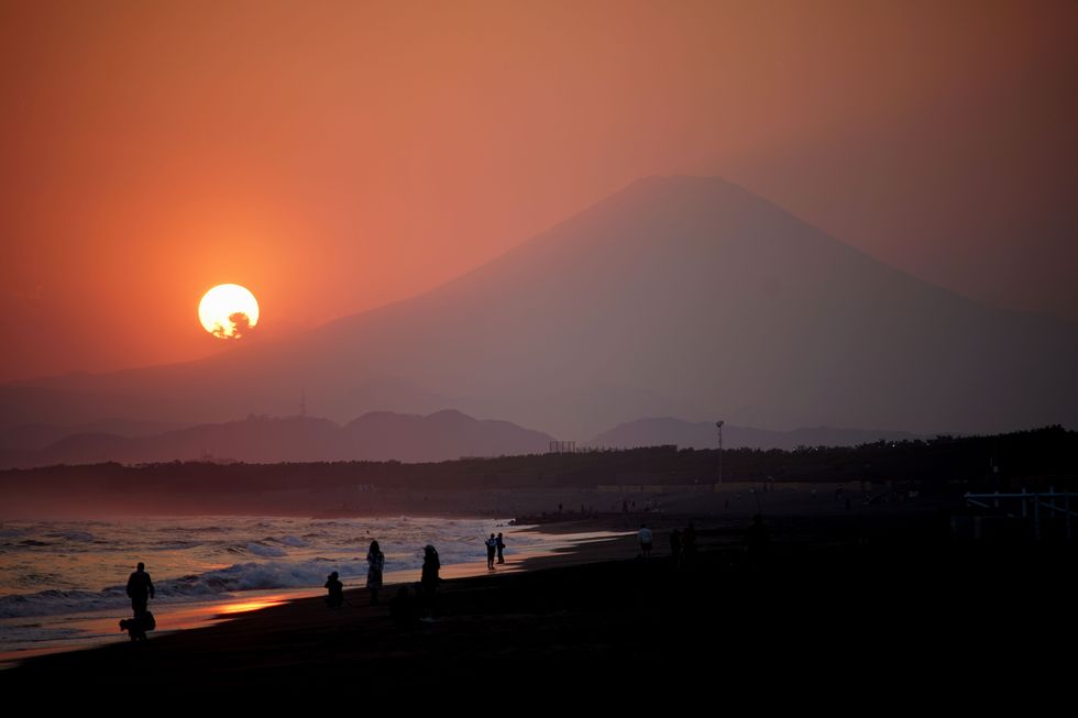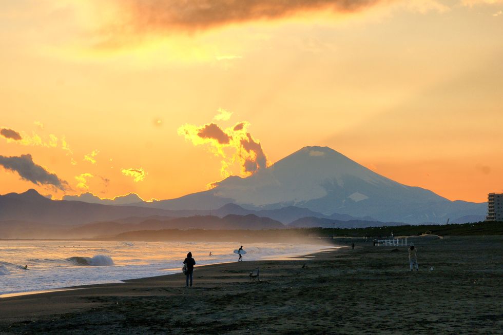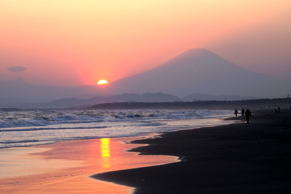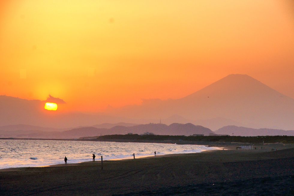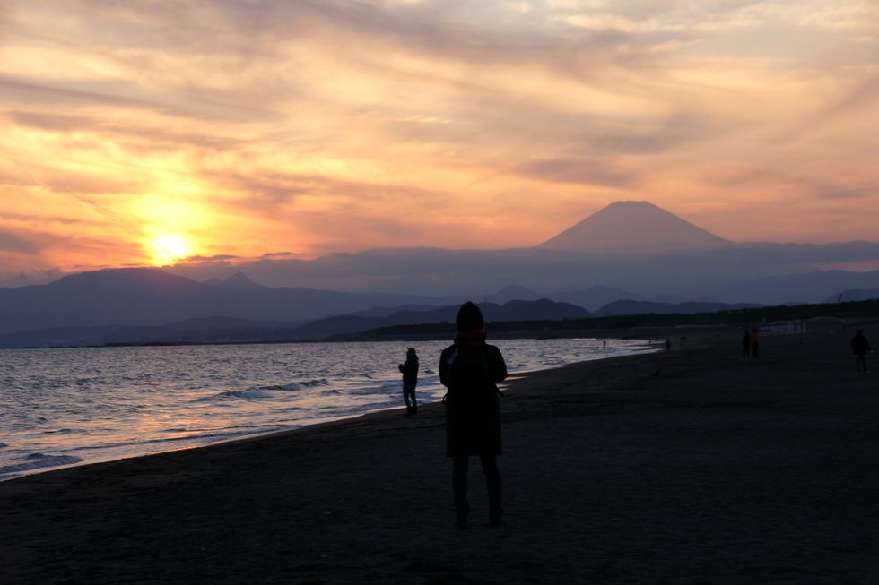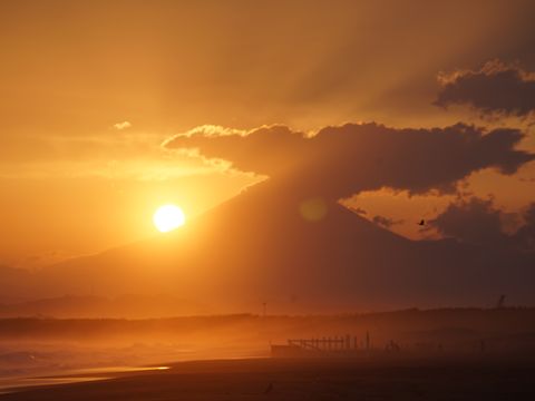 春霞の富士山夕景@辻堂海岸