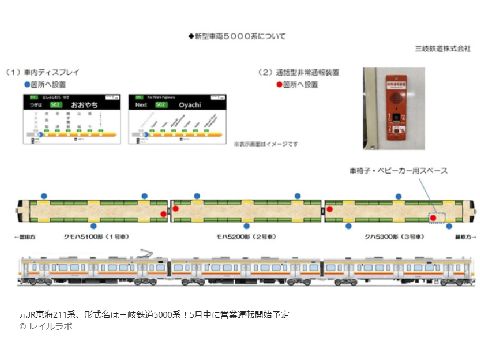 三岐鉄道「新」車両は5000系にこれまでの西武の中古車両を一掃し交代へ、211系の中でもJR東海が製造した比較的新しい車両。車内も床や壁を換え LCD案内設置や照明LED化など近代的な装備に。 |