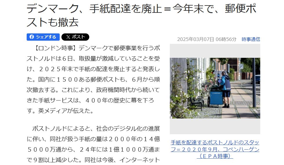 日本郵便の近い将来を暗示する?デンマークで郵便配達廃止へ手紙の数が激減(9割以上減)でポストを撤去して手紙配達を中止するとの発表、小荷物の配達は継続する。 近未来の日本郵便の置かれる環境を示すものだろう、やたらにある郵便局の維持が困難なのは自明なのに税金?で補填させようとする 不実な対応。 |