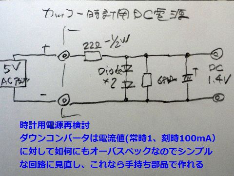 カッコウ時計(鳩時計)の電源検討刻時以外の消費電流が1-2mAであるらしいので以前考えた回路は如何にも大げさ、単純なダイオード2個に回路で 十分だろう、常に100mA流れるのは勿体ない気もするが(5V-0.1Aなので0.5W、待機電力以下のレベル。) |