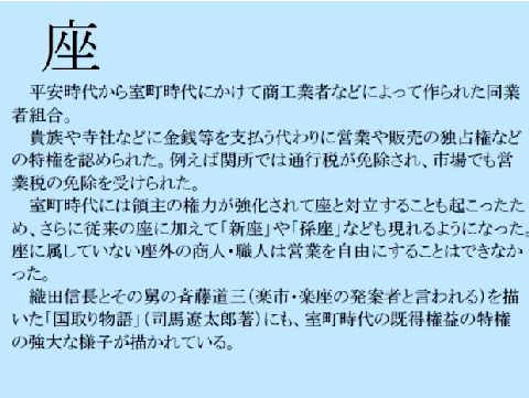 「楽市楽座」が必要な時代なのか?既成の権力組織だった「座」、これを壊したのがあの織田信長、当時の既存の権力組織には寺社仏閣もあり武装して時の政権や 朝廷を脅迫して自分たちの要求を通していた(朝廷側も都合よく利用していた側面もあるのだが)。 |