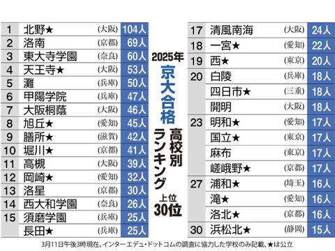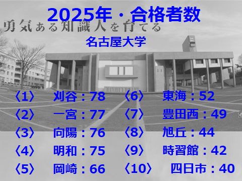 国立大・前期の合格発表母校の明和高校は学年定員284名、4人に一人以上が名古屋大へという結果。東大は少ないが京大はそこそこ合格者がいる。 旭丘は名古屋大で少ない分が京都大へ進学しているということのよう、明和のほうが地元志向が強い? |