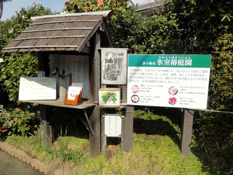 庭園の入口三井不動産の副社長を務めた方の別荘、引退後の住宅。広いゆったりした土地に多数の椿の木が植えられている。 夫妻が死去後に茅ヶ崎市に寄付されて公園になっている。 建物は大分古いので痛んできている様だが、今後の保存にも課題有り(現在は茅ヶ崎市の所有) |