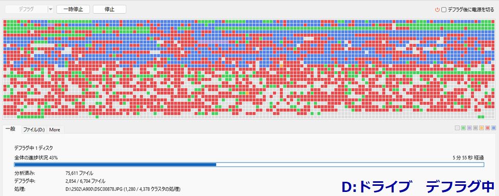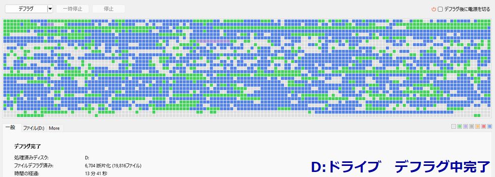 SSDをデフラグしてみたSSDはHDDのようなシークェンシャルアクセスでは無いので通常はデフラグは不要とされている。しかしファイルが細切れになり過ぎると アクセス速度が確かに下がるのでデフラグを掛けてみた、最適化は不要なので行わず。 |