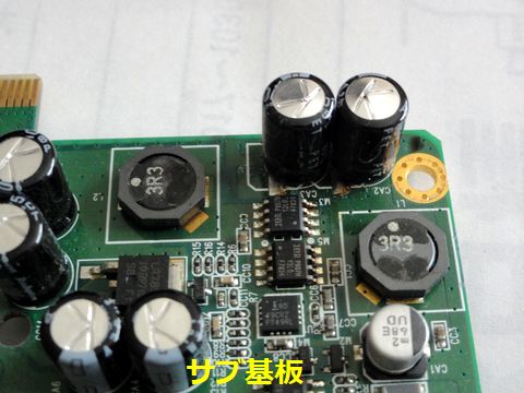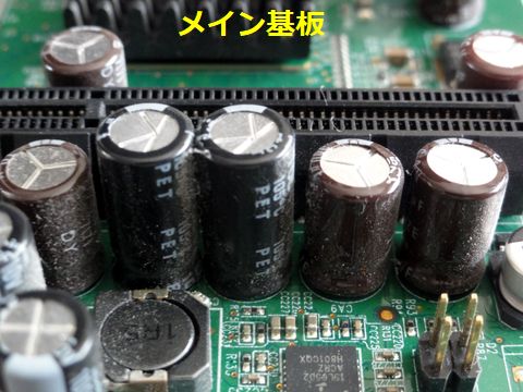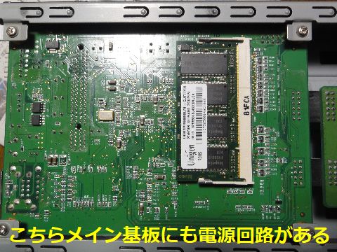 マザーボード部のコンデンサが怪しいがマザー基板と接続して通電するとACアダプタが落ちてしまう、マザー基板のどこかで短絡している。コネクタ近くの並んだ電解コンデンサが 怪しいが外見上は問題なし(105℃品)、電源部のFETあるいはレギュレータICが短絡故障なのかも、判別はできず。 |