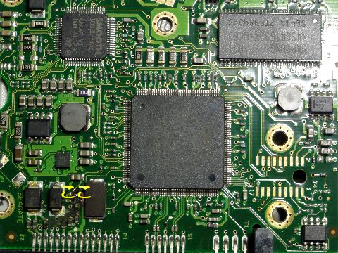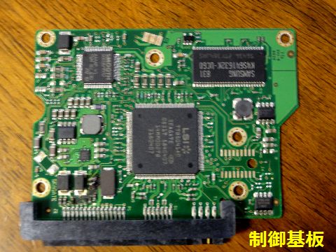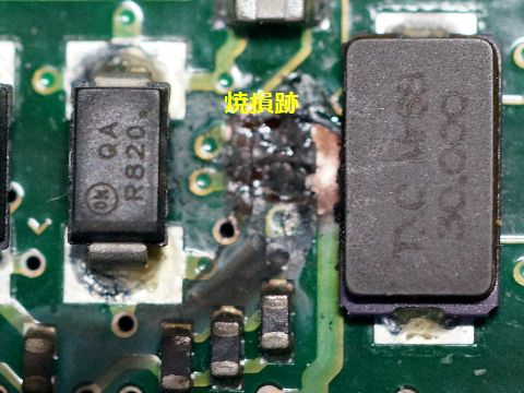 NAS、HDDの一連の故障はHDD基板のコンデンサ焼損?制御基板を観察すると電源入口にあるコンデンサ?と思われる素子が焼損している部分を発見、これでHDDは故障、 電源短絡でNAS基板の電源部も故障、引っ張られてUPSも落ちたという経過のようだと判明。 |