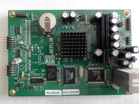 破損したNASの分解調査まずは電源プラグやHDDコネクタがある基板、この基板はコネクタでメインのマザーボードと接続している。単体ででACアダプタへ繋ぐと電源は 落ちないのでここまでは正常、頭の膨らみかけた電解コンデンサが2つあるがまだ大丈夫のよう(使用するなら交換必要)。 |